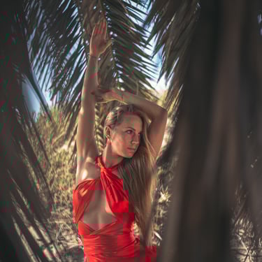 A curated flying dress is available in red, designed to move beautifully with light and wind.